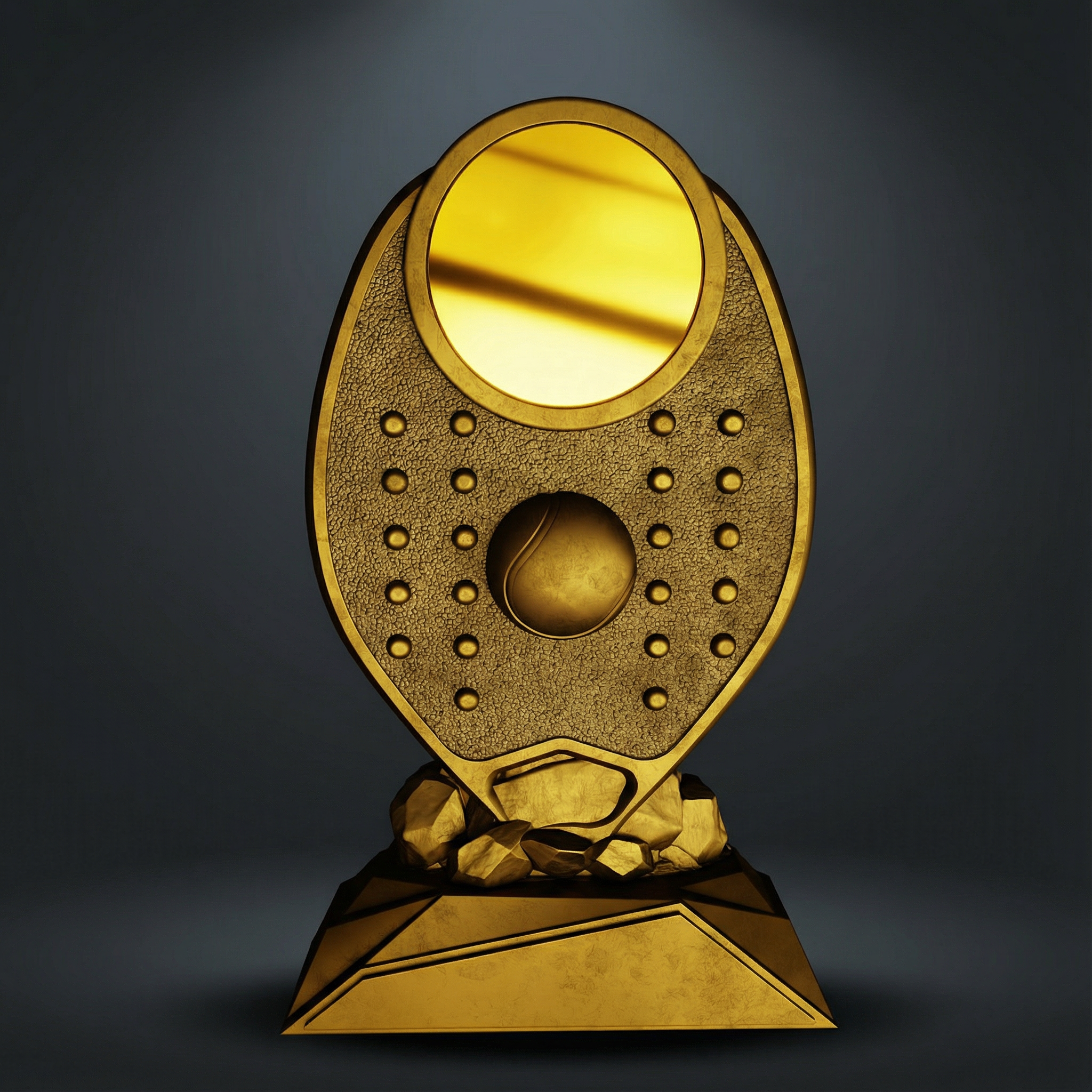 Ideal para torneos temáticos o finales de temporada. Trae la iconografía del beach tennis con pelota en relieve en el centro, medallón frontal para logo del evento y base geométrica facetada que añade volumen y sensación de «roca».