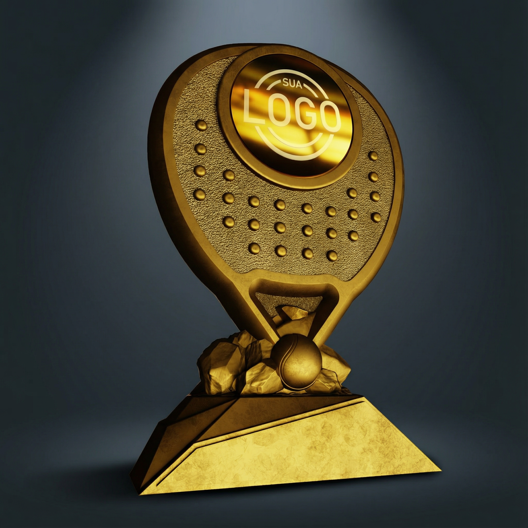 Trofeo con elemento central destacado y marcos laterales que crean profundidad. Equilibra heroísmo (conquista) y espacio para branding, lo que genera buenas fotos de podio. Evoca heroísmo.