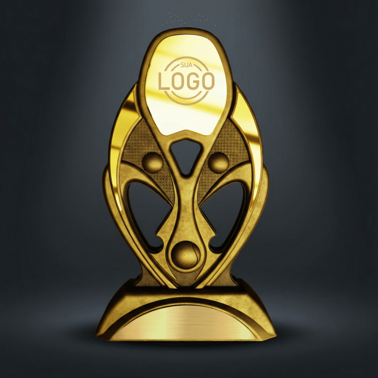 Trofeo Ville personalizado en 3D de 21 cm de altura. Disponible en 4 colores: Ouro, Prata, Bronze y Cobre.