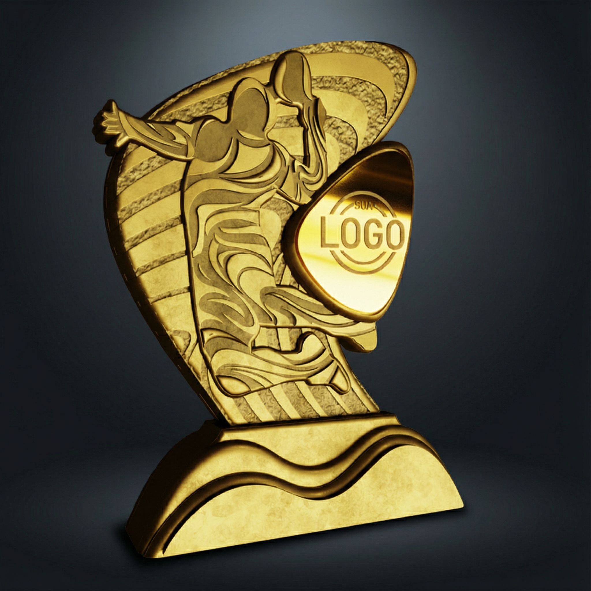 Equilibra compacidad y presencia en el podio. El área frontal acepta artes con textos cortos (etapa/ciudad) e íconos de patrocinador sin apretar la
