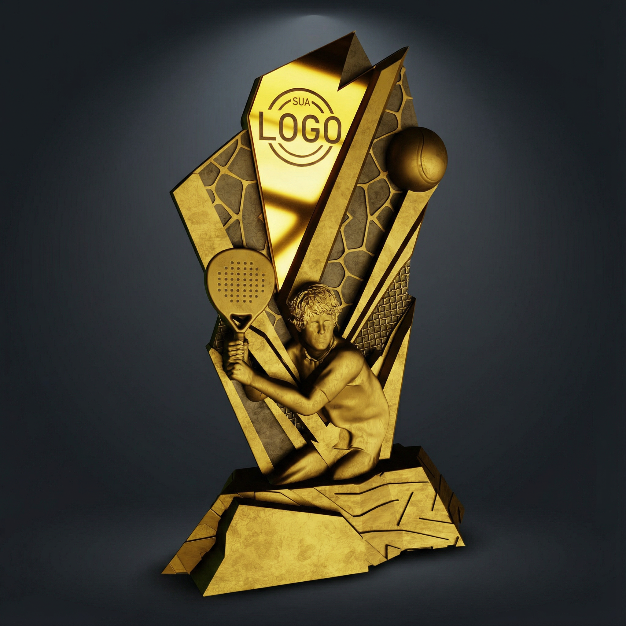 Pieza de 21 cm, formato geométrico, lectura actual y fácil de estandarizar. Funciona bien en arenas indoor y eventos con identidad visual fuerte.
