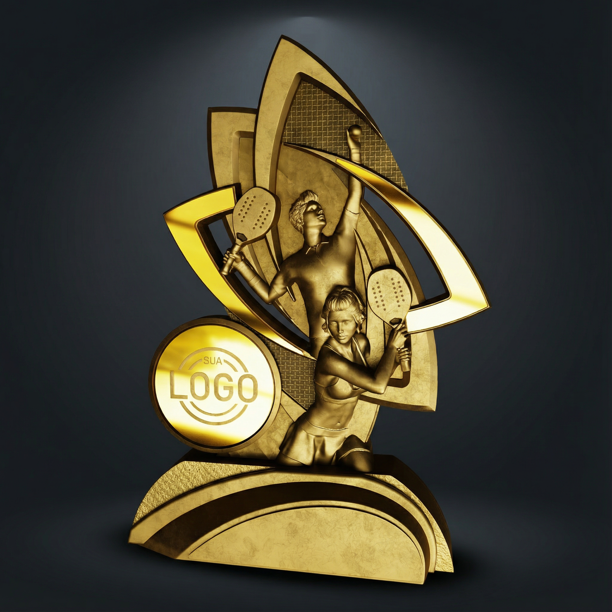 Pieza de 21 cm con composición impactante: dos atletas en acción, raquetas en evidencia y marcos curvos superpuestos que sugieren movimiento. El círculo frontal acomoda el logo del evento con excelente destaque. Visual ideal para torneos de dupla y etapas de mayor atractivo fotográfico, manteniendo lectura clara en el podio y en redes.