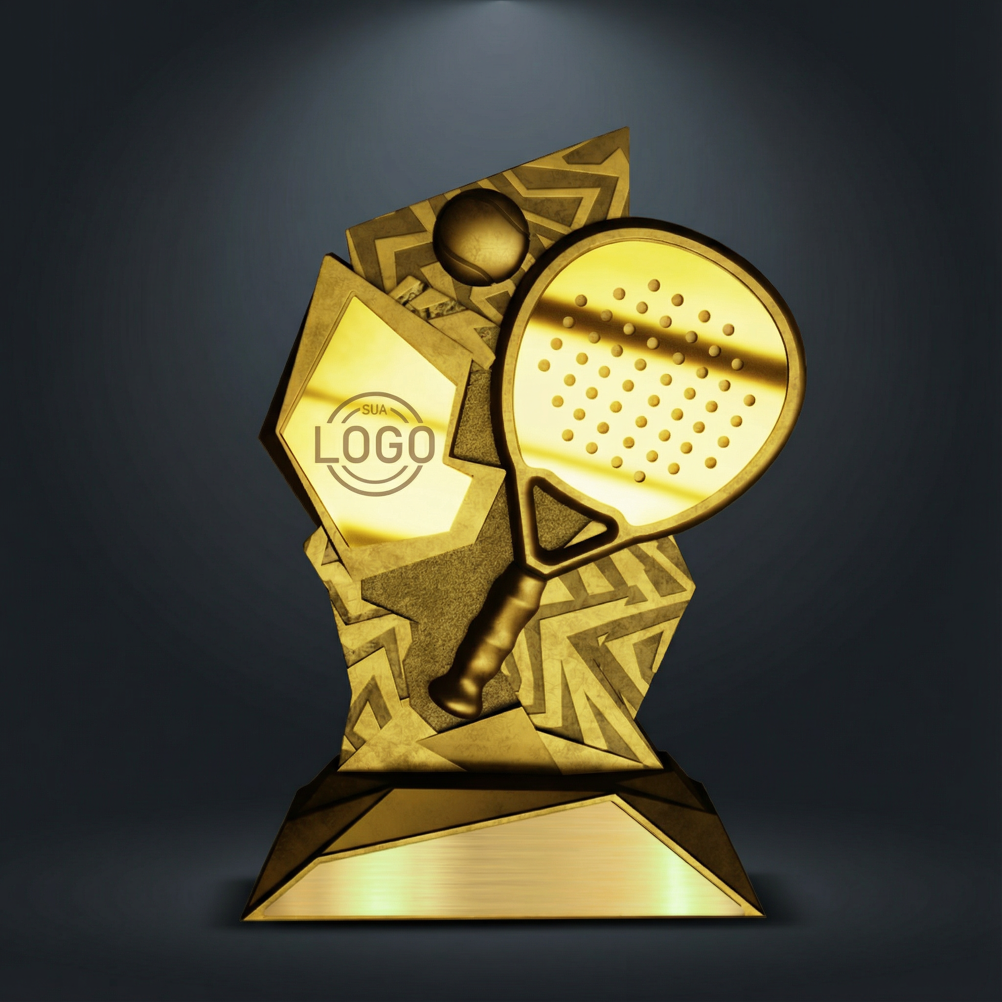 Modelo de 21 cm con recortes que sugieren movimiento y velocidad, sin sacrificar el área para logo/patrocinio. Ideal para circuitos jóvenes o torneos que buscan estética contemporánea. La pieza luce bien en foto (indoor/outdoor) gracias al contraste de planos.